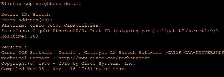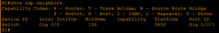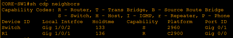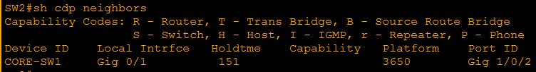 • SW1 should have 2 CDP neighbors: R1 and SW2
