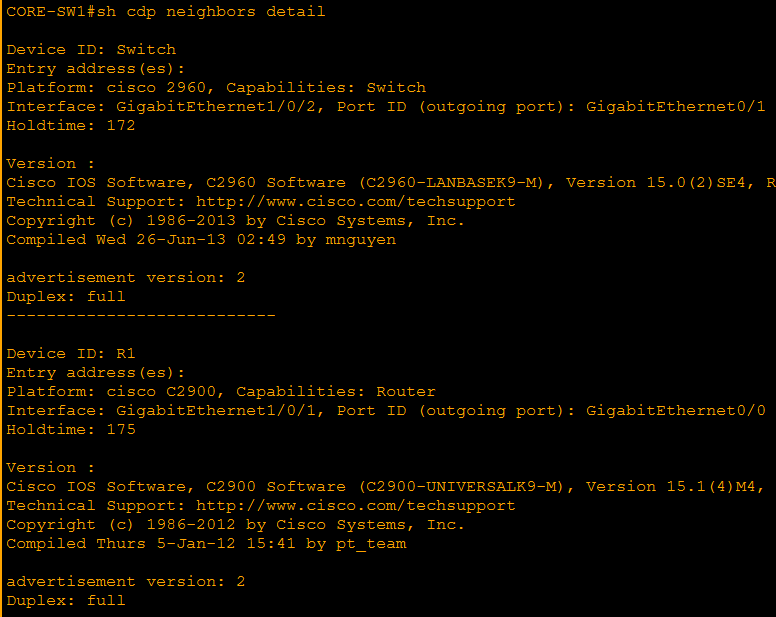 • CORE-SW1 won’t see SW2 as a CDP neighbor on G0/2 (or it will be one-way depending on what you disable).