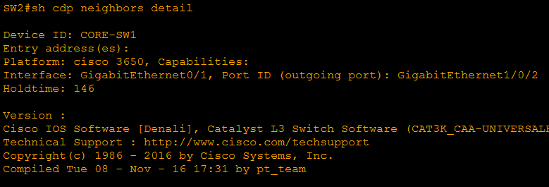 • On SW2: show cdp neighbors detail (confirm SW1 mgmt IP + platform + port ID)