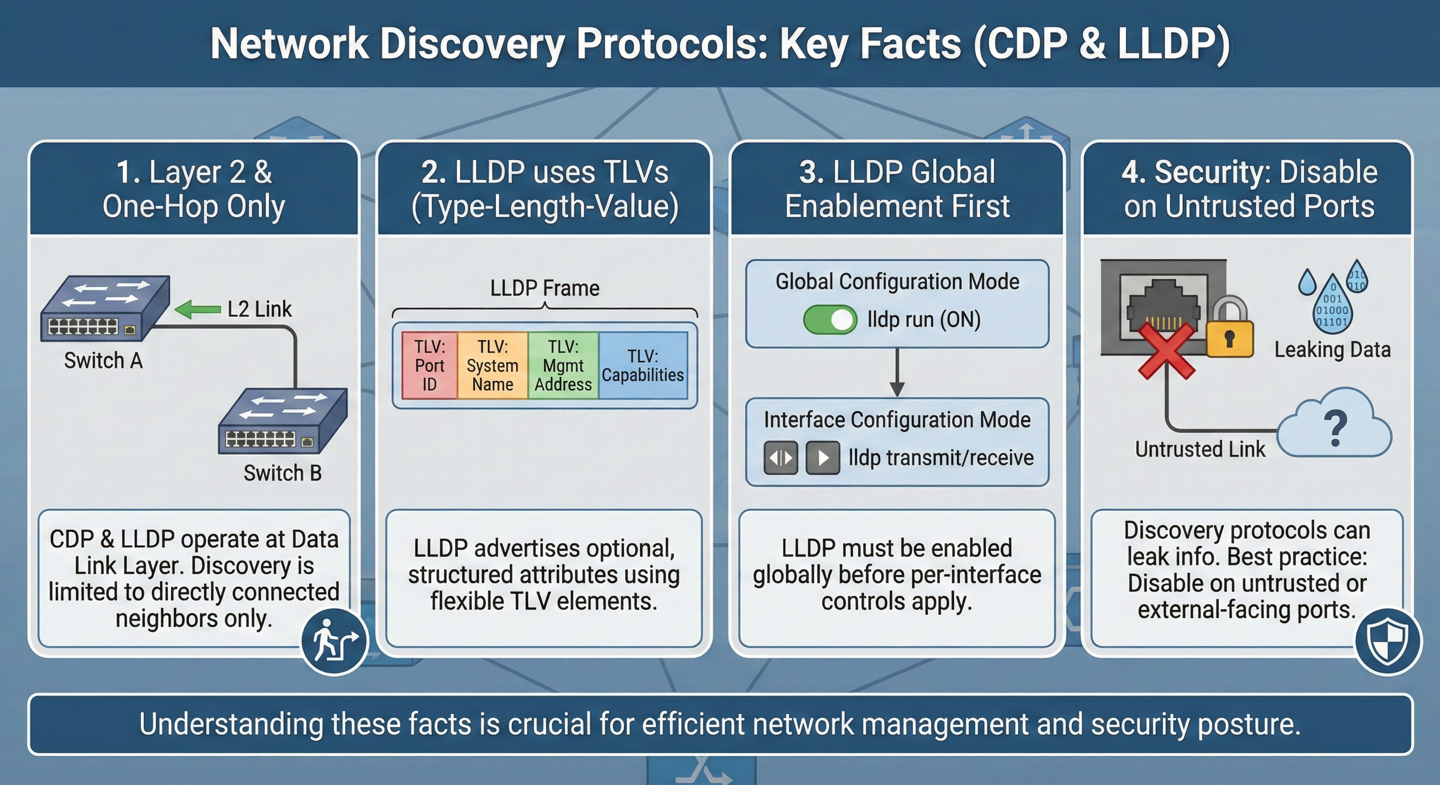 Operational limitationsNot routed; doesn’t replace STP/LACP/port-security; only tells you what neighbors advertiseSame; link-local only; doesn’t validate correctness; depends on neighbor honesty/config