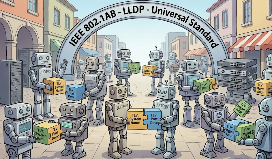 Super necessary mental modelL2 beacons + TTL-based neighbor table used for topology/troubleshootingSame, but standardized TLVs + endpoint policy via LLDP-MED