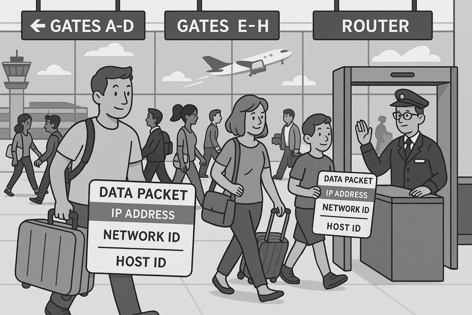 As you make your way through the airport, you pass through several checkpoints — security, customs, boarding gates. Each checkpoint functions like a router. The staff don’t escort you personally or track your whole journey. They simply glance at your boarding pass, decide the correct direction, and wave you forward. In networking, that’s exactly what routers do with packets.