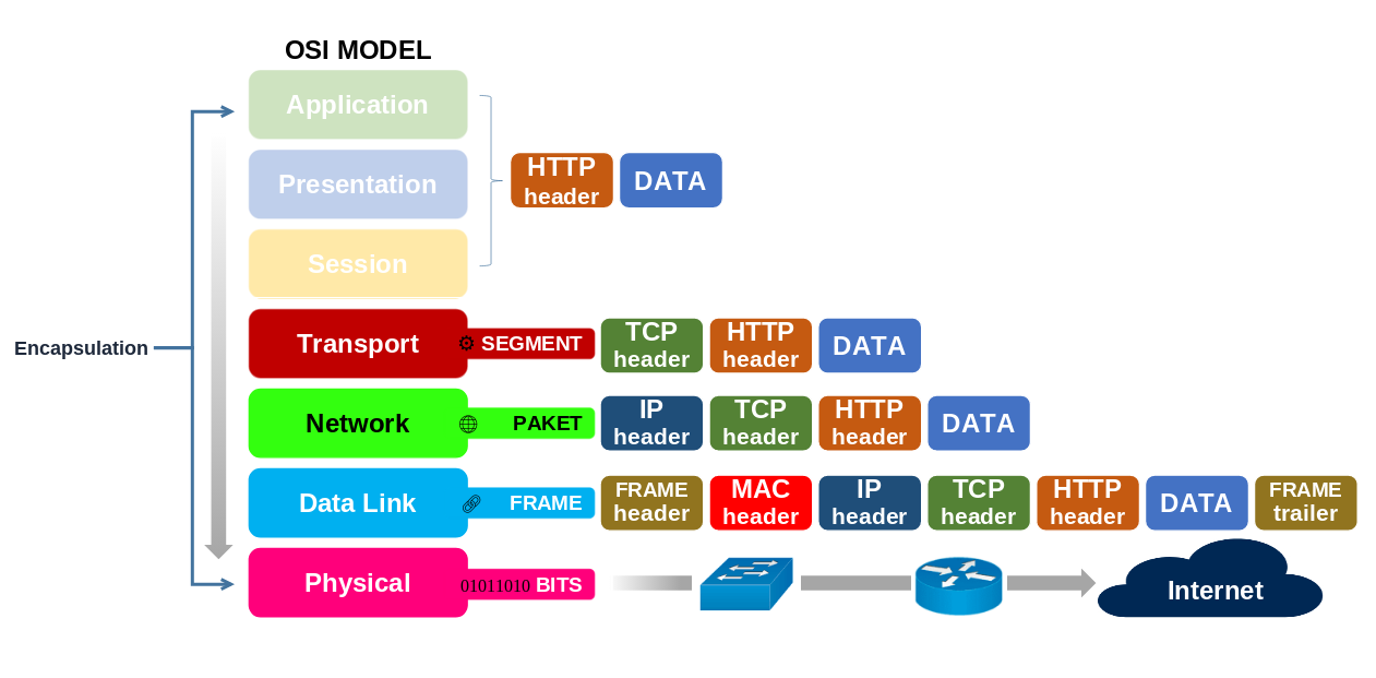 - Header – information about where the packet is from, where it’s going, and how to handle it (e.g., source and destination IP addresses, TTL, protocol type).