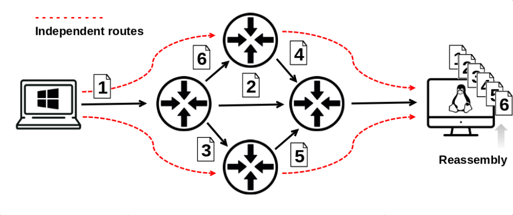 Reassembly at the Destination: The receiving host uses sequence numbers (from higher-layer protocols like TCP) to reassemble packets in the correct order, recreating the original message.