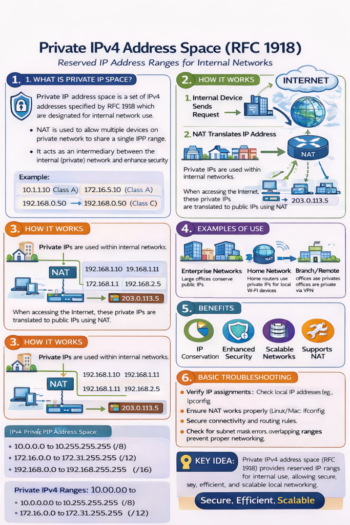 - Private addressing (RFC 1918) allows reuse of internal IP ranges across multiple organizations.