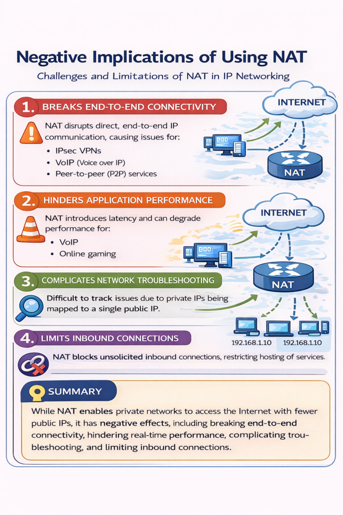 NAT introduces limitations that affect network design, security, and application functionality.