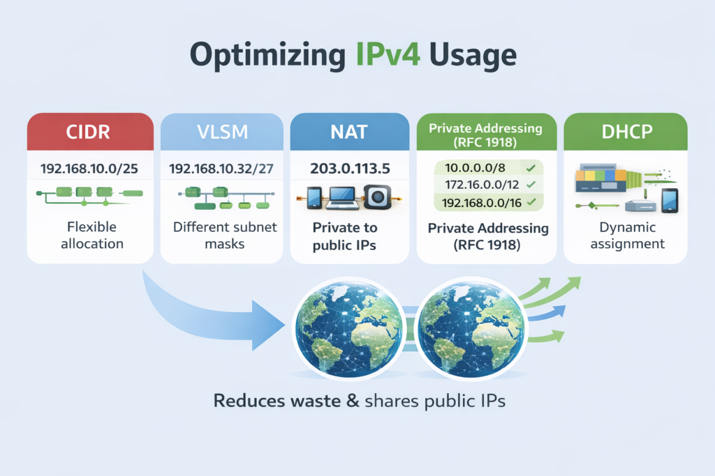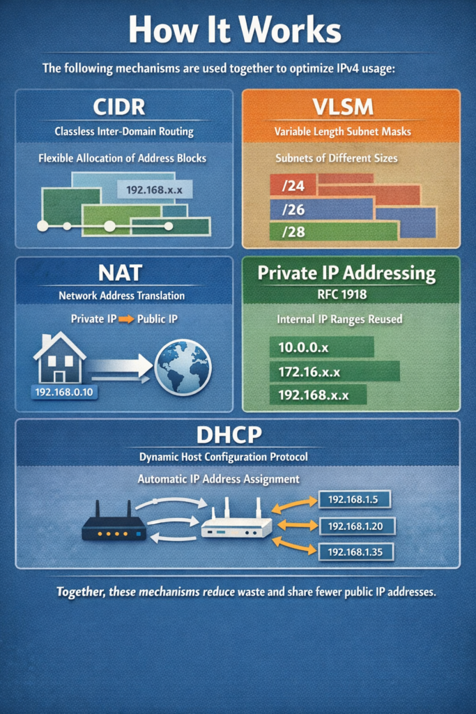 IPv4 exhaustion is mitigated through techniques that optimize address allocation and reuse. CIDR, VLSM, NAT, and private addressing work together to extend IPv4 usability while supporting modern network growth.