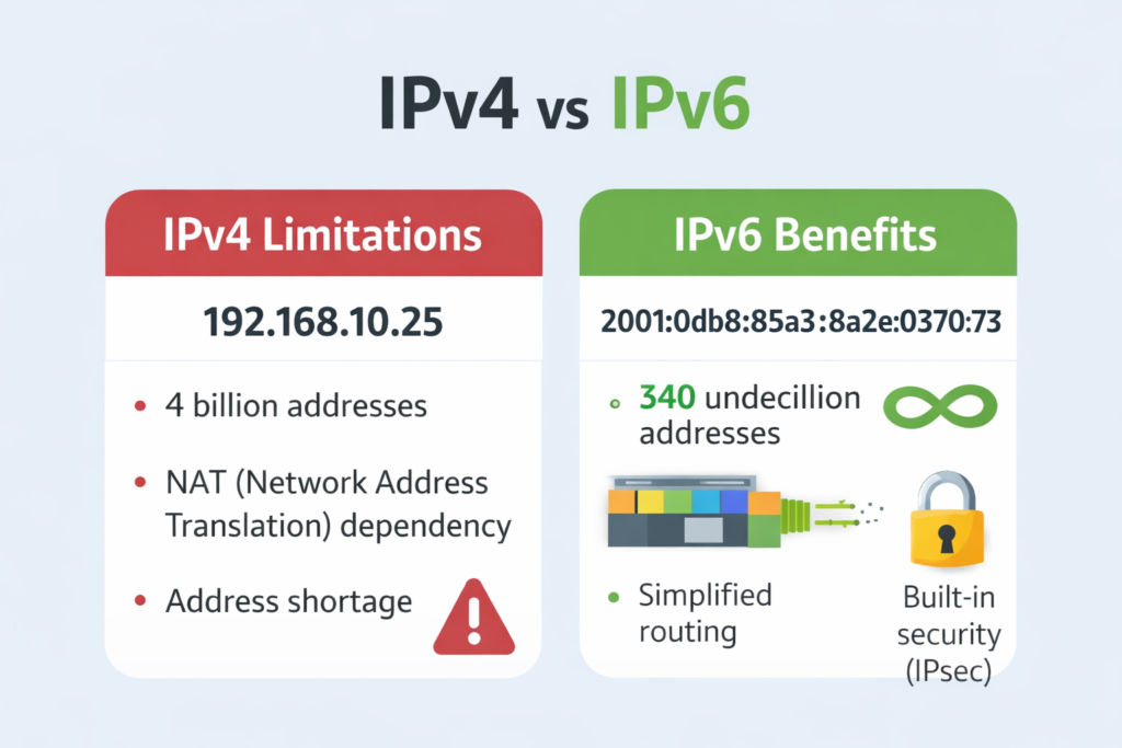 As the global internet continues to expand, the limitations of IPv4 have become increasingly evident. The 32-bit addressing structure of IPv4 cannot provide enough unique addresses to support the growing number of users, devices, and services. To address this limitation, IPv6 was introduced as the next-generation Internet Protocol.