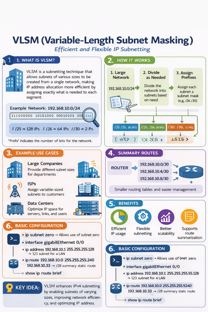 - Smaller networks use shorter subnets (e.g., /30 for point-to-point)