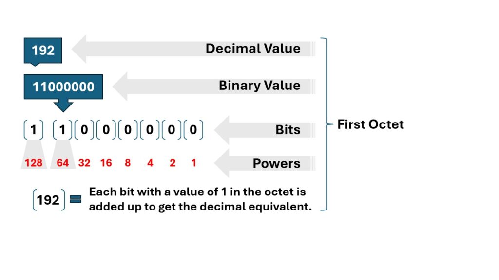 The illustration explains how the binary value 11000000 becomes the decimal value 192, focusing on the first octet of an IPv4 address.