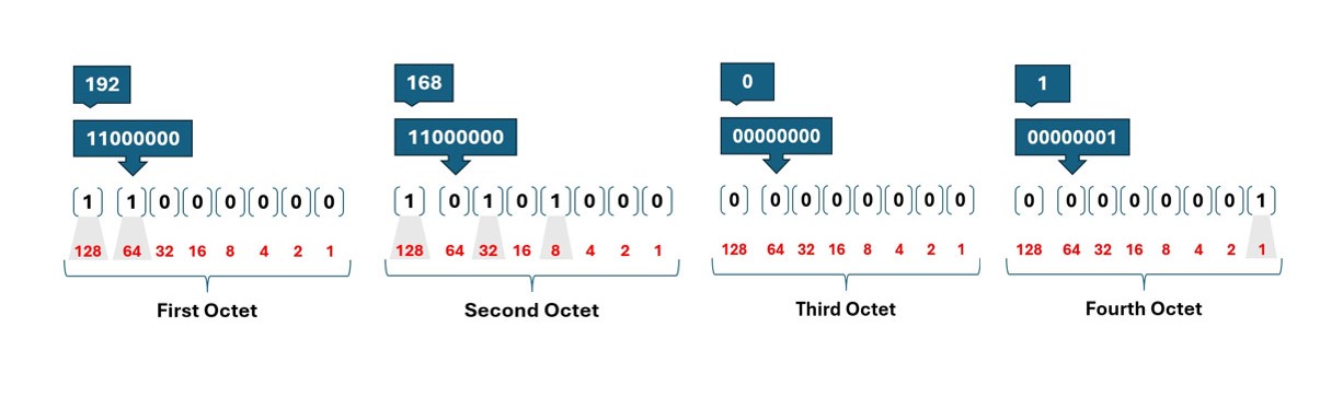 The image below applies the same logic shown earlier, illustrating how all four octets together form the IPv4 address 192.168.0.1.