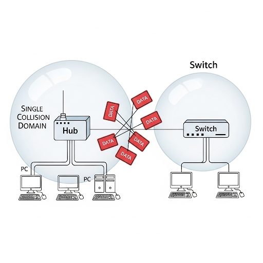 - How It Works: The devices follow Carrier Sense Multiple Access with Collision Detection (CSMA/CD). They “listen” before speaking. If two “speak” at once, both stop, wait a random time, and try again.