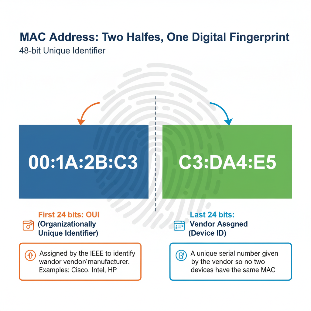 MAC addresses: 48 bits, written in hex, unique to each device.