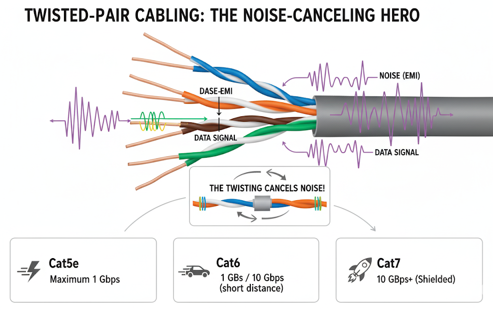 Because when two wires are twisted together, the electromagnetic interference (EMI) they pick up from outside sources tends to cancel out. Think of it like two friends whispering secrets in a noisy cafeteria — by leaning in close and speaking in sync, they can hear each other even when the room is chaotic.