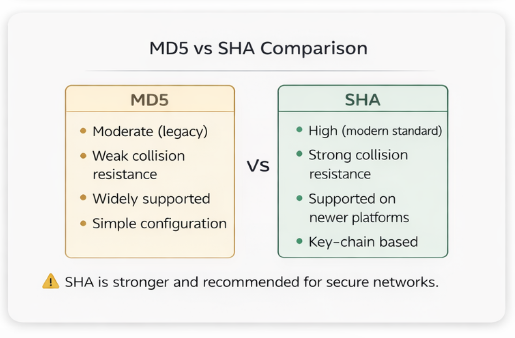 MD5 is considered cryptographically weak by modern standards. While still commonly used in networking, organizations with strict security requirements prefer stronger algorithms like SHA.