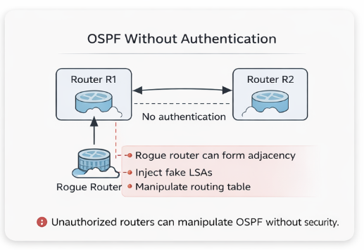 OSPF routers exchange routing information dynamically. Without authentication, any device capable of sending OSPF packets could: