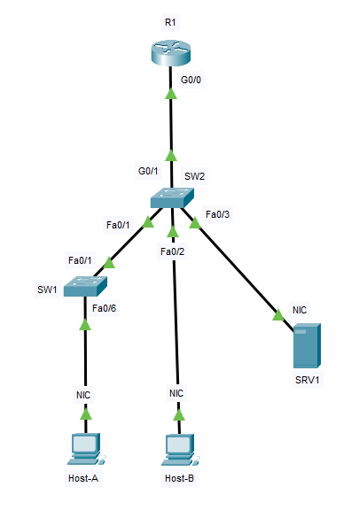 - Host-A, Host-B, SRV-1, SW1, SW2, and R1 can all communicate as expected