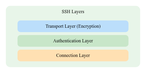 SSH uses three main security layers. Transport Layer establishes a secure, encrypted channel and protects against eavesdropping and tampering. User Authentication Layer verifies the identity of the client using passwords, keys, or other methods. Connection Layer manages multiple logical channels inside the encrypted tunnel, allowing secure remote commands, file transfers, and port forwarding.