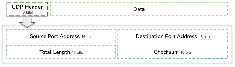 The UDP header is simple—only 4 fields, each 16 bits, totaling 8 bytes